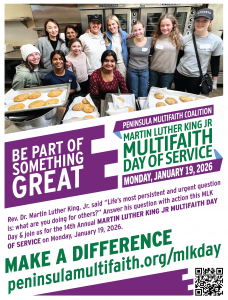 Founded in 2012, the Peninsula Multifaith Coalition (located on the mid peninsula of the San Francisco bay area) is a group of faith congregations and organizations working together on projects to improve our community. This volunteer led coalition holds or supports several events each year, such as the Peninsula Multifaith Day of Service on MLK Jr. Day, Interfaith Prayers for Peace in the summer, and the annual Peninsula Freedom Seder, held in the spring.
